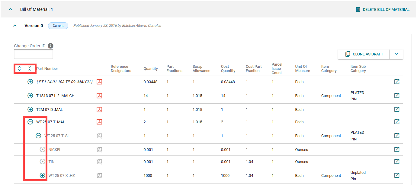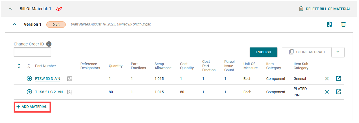 A draft can be updated continuously until published. Once published, the bill of material version goes live in production.