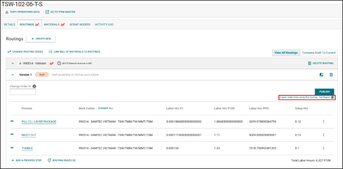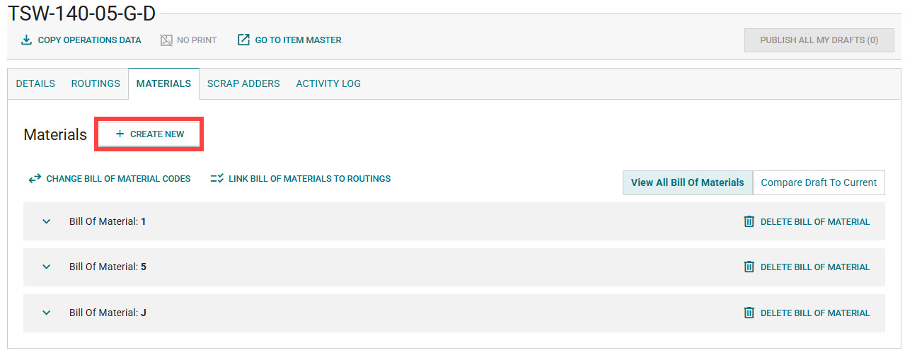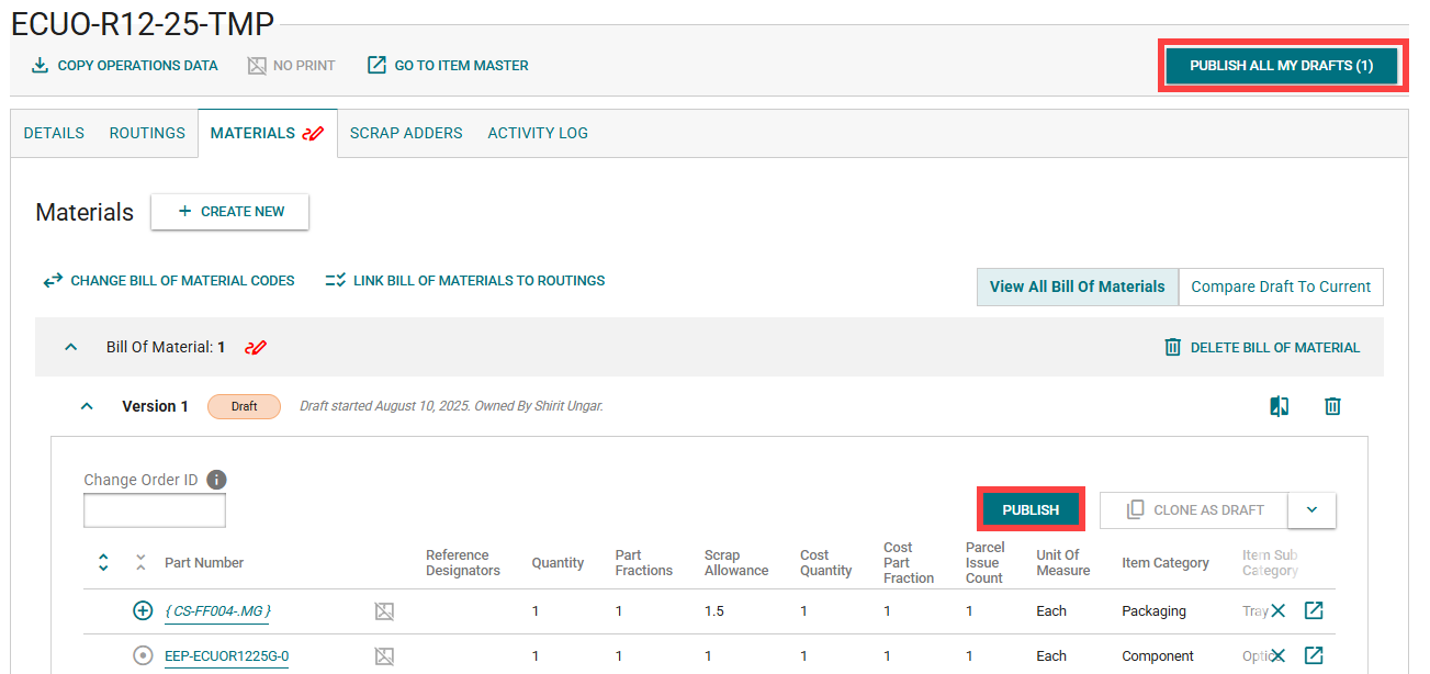 - Click Publish All My Drafts which will publish both Bill of Material and Routing drafts owned by you.