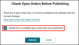 Upon clicking Publish, a modal will appear showing the number of open orders and the count of those eligible for updates. This modal will also contain a link to the Excel document.