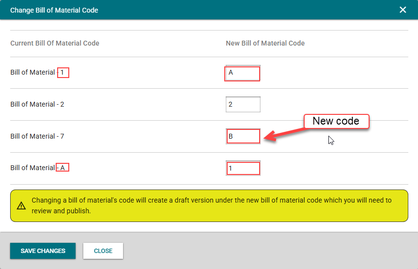 - Example: Clicking Clone to Bill of Material 2 will copy bill of material code 1 as a draft to bill of material code 2. The user can then edit the draft bill of material code 2 details and publish as needed.