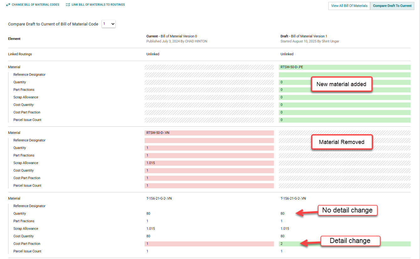 You can compare between a draft to a current version if both exist for a bill of material code.