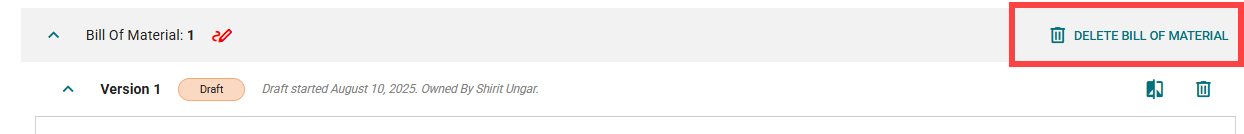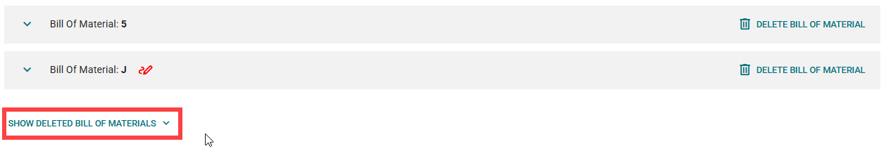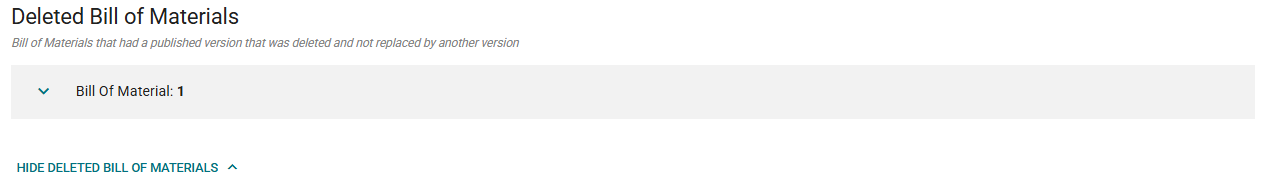 - To view deleted Bill of Materials, click Show Deleted Bill Of Materials. A list of the deleted bill of materials will show, and you can open each one of them to see the details and clone to draft if needed.
