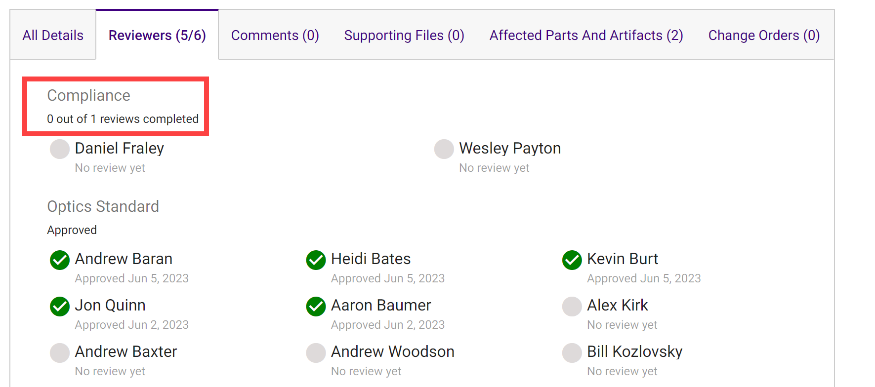 The Review Team will display the review status for each member in the review group