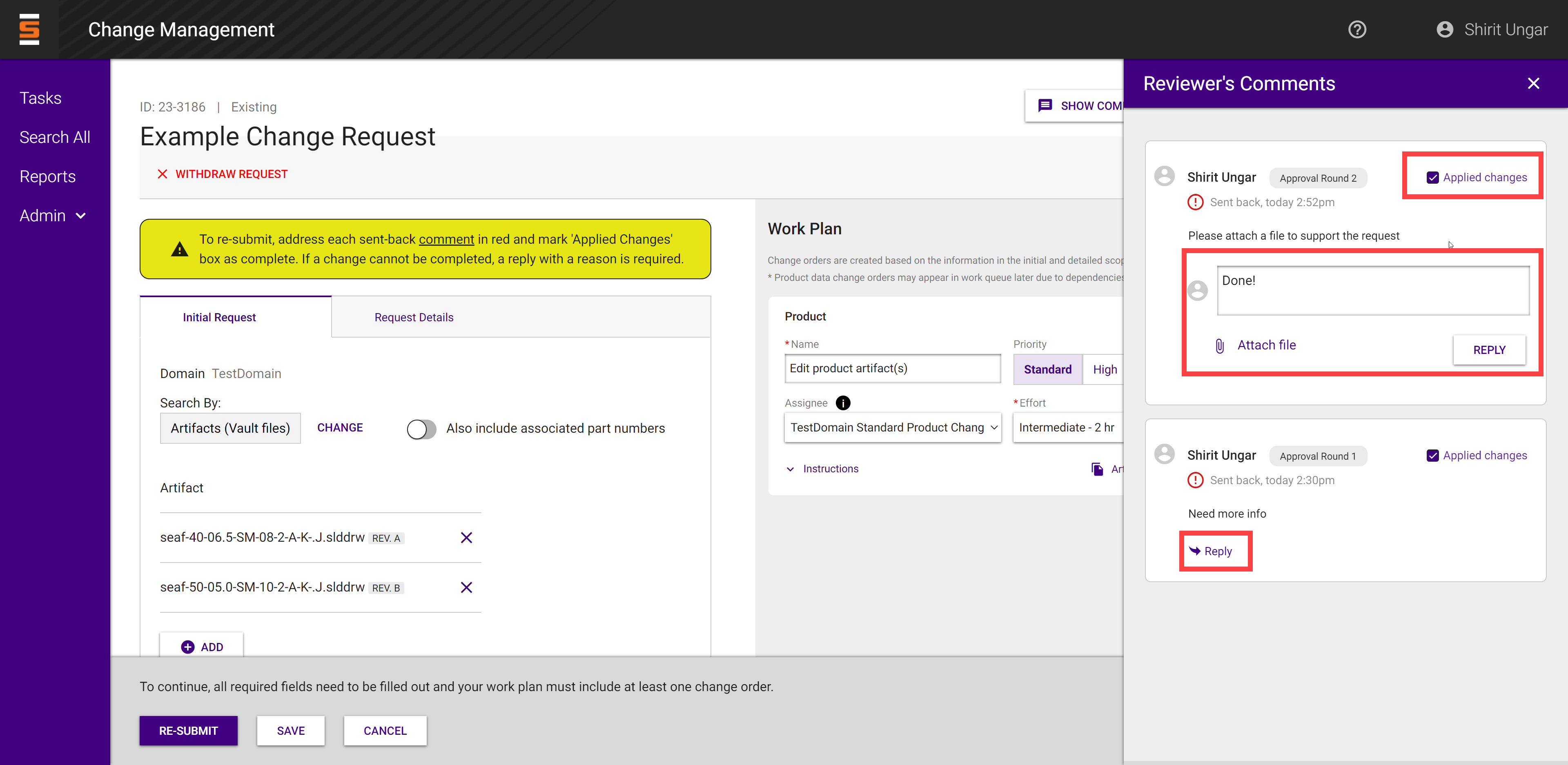 The request owner must address comments from the approver by editing the request and checking the applied changes checkbox or replying to the comment.
