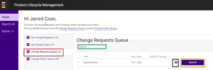 Change requests will display here for users in the Change Request Owner group to pick up and own.