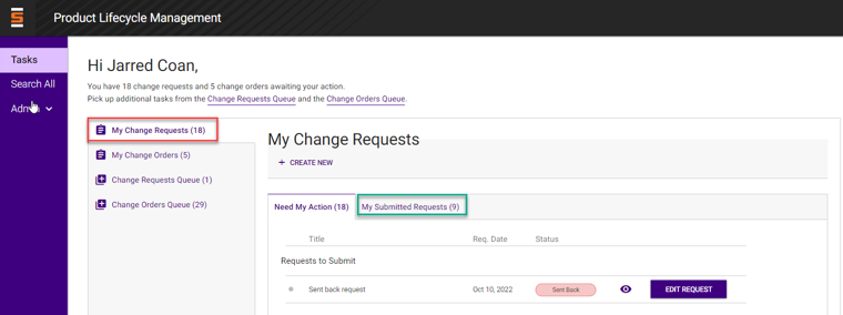 - Requests to submit - Displays drafts or Change Request that an approver has sent back.