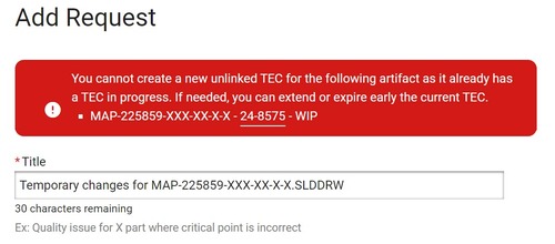 You cannot start a TEC request on an artifact that already has a TEC in progress as you might see the following error. If you must have a new TEC with new copy, expire the first TEC and create the new one which will go through the approval process.
