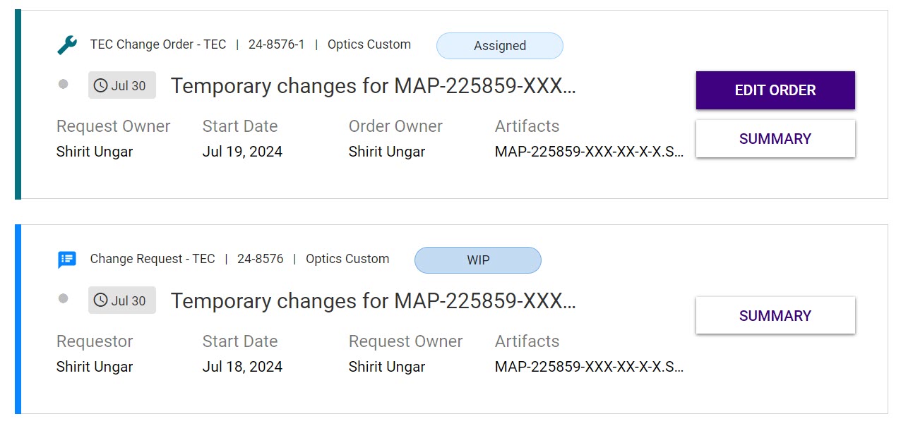 - Once approved, the TEC change order is immediately initiated and the request owner owns the order.